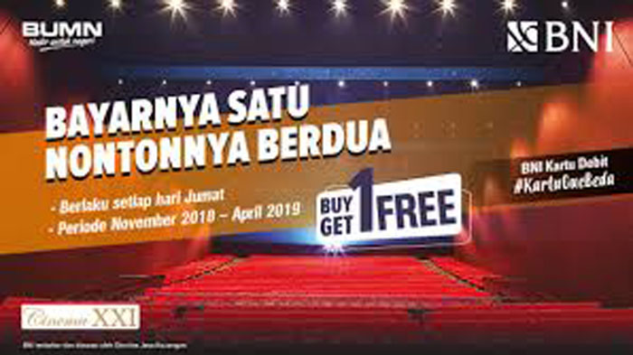 Bekerjasama dengan jaringan bioskop Cinema XXI, BNI memberikan promo beli 1 tiket nonton film gratis 1.