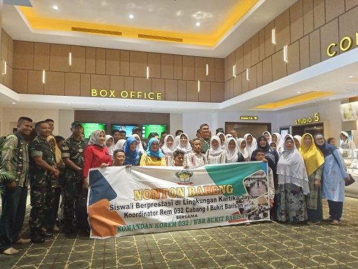 Nonton bareng itu dihadiri oleh Komandan Korem 032/Wirabraja bersama siswa berprestasi di lingkungan Kartika Jaya Koordinator Rem 032 Cabang I Bukit Barisan.