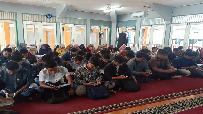 Selanjutnya, penyampaian materi dari nara sumber, termasuk pembacaan ayat suci Alqur'an secara bersama-sama yang dipimpin oleh salah seorang mahasiswa.