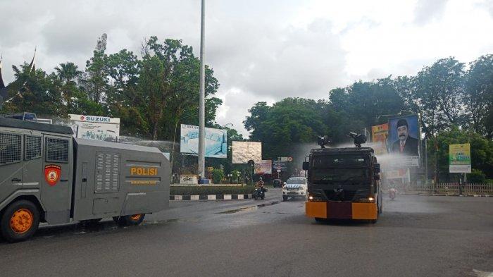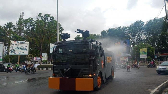 TRIBUNPADANG.COM, PADANG - Polda Sumatera Barat (Sumbar) mengerahkan 2 unit mobil water canon untuk menyemprotkan disinfektan di Padang, Minggu (22/3/2020).