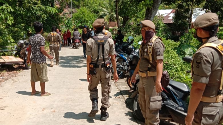 Satpol PP mengimbau agar selalu menggunakan masker dan menjaga jarak untuk mencegah penyebaran Covid-19.