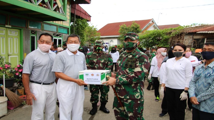 Pada kesempatan tersebut Korem berbagi paket sembako kepada 150 kepala keluarga (KK), yang umumnya hanya mengandalkan penghasilan harian.