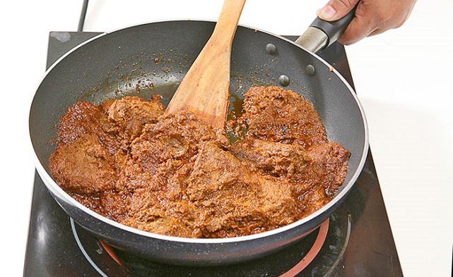 Penggunaan api yang besar saat memasak rendang membuat tekstur daging mudah hancur saat diaduk.