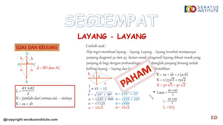 - Luas = (d1 x d2) : 2