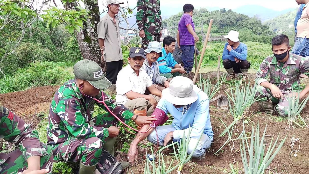 Pelda Sugianto Satgas TMMD dari Denkesyah 01.04.04 Padang dan tim mendatangi warga ke kebun-kebun warga khususnya yang berdekatan dengan lokasi pembukaan ruas jalan baru TMMD di Nagari Panyalaian Kecamatan X Koto Tanah Datar.