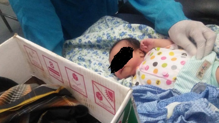 Sesaat ditemukan, kondisi bayi tersebut berselimut kain sarung di dalam kardus minuman kemudian diletakkan di pinggir jalan.