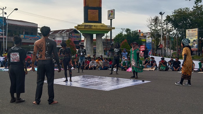 Setibanya di Simpang DPRD Sumbar, mereka langsung memblokade jalan dari arah Jalan Khatib Sulaiman lalu menggelar aksi. Di antaranya, mempertontonkan aksi teatrikal saat berunjuk rasa tersebut.