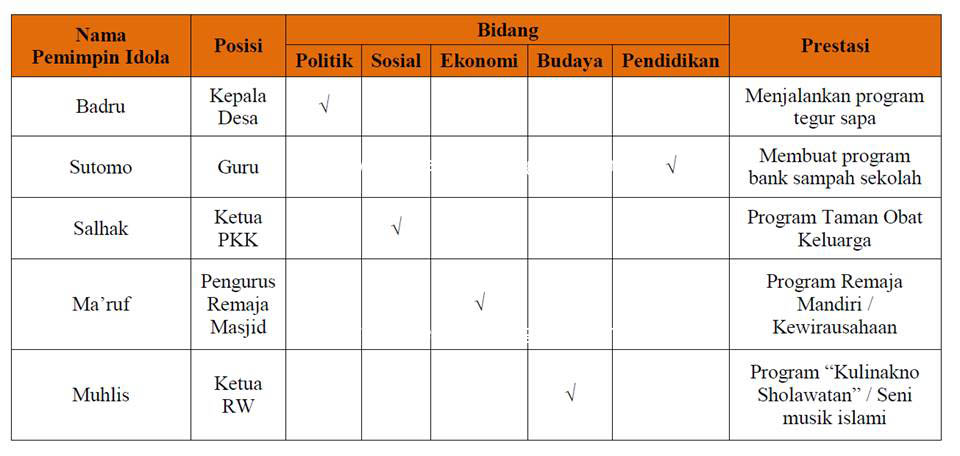 Pemimpin idola dapat berasal dari berbagai kalangan. Diskusikan siapa saja para pemimpin idola teman sekelasmu. Apakah mereka bekerja di bidang politik, sosial, budaya, ekonomi atau pendidikan. Catat hasil diskusimu. Kamu bisa mempelajari contoh yang diberikan.