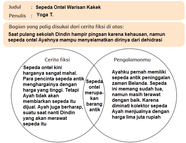 - Jelaskanlah persamaan dan perbedaan cerita tersebut dengan peristiwa yang pernah kamu alami atau yang pernah kamu tonton dari sebuah film. Gunakan diagram venn berikut sebagai bantuanmu. Tuliskan pokok pikiran yang ada di dalam cerita fiksi pada bagian cerita fiksi. Tuliskan pokok pikiran dari pengalamanmu atau dari film yang ditonton pada bagian yang lain. Tuliskan kesamaan antara keduanya di bagian tengah diagram venn.