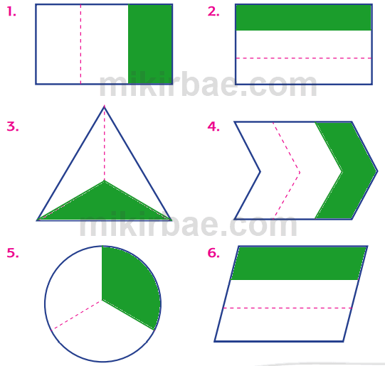 Terdapat tiga potongan sama besar = 1/3 bagian . Masing-masing potongan = 1/3 bagian. Ada potongan 1/3 sebanyak 3 buah.