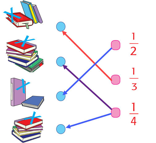Pada setiap tumpukan buku paling atas bertanda X. Pasangkanlah bilangan pecahan yang sesuai dengan pecahan yang menunjukkan banyak buku yang bertanda X pada tumpukan buku berikut ini!