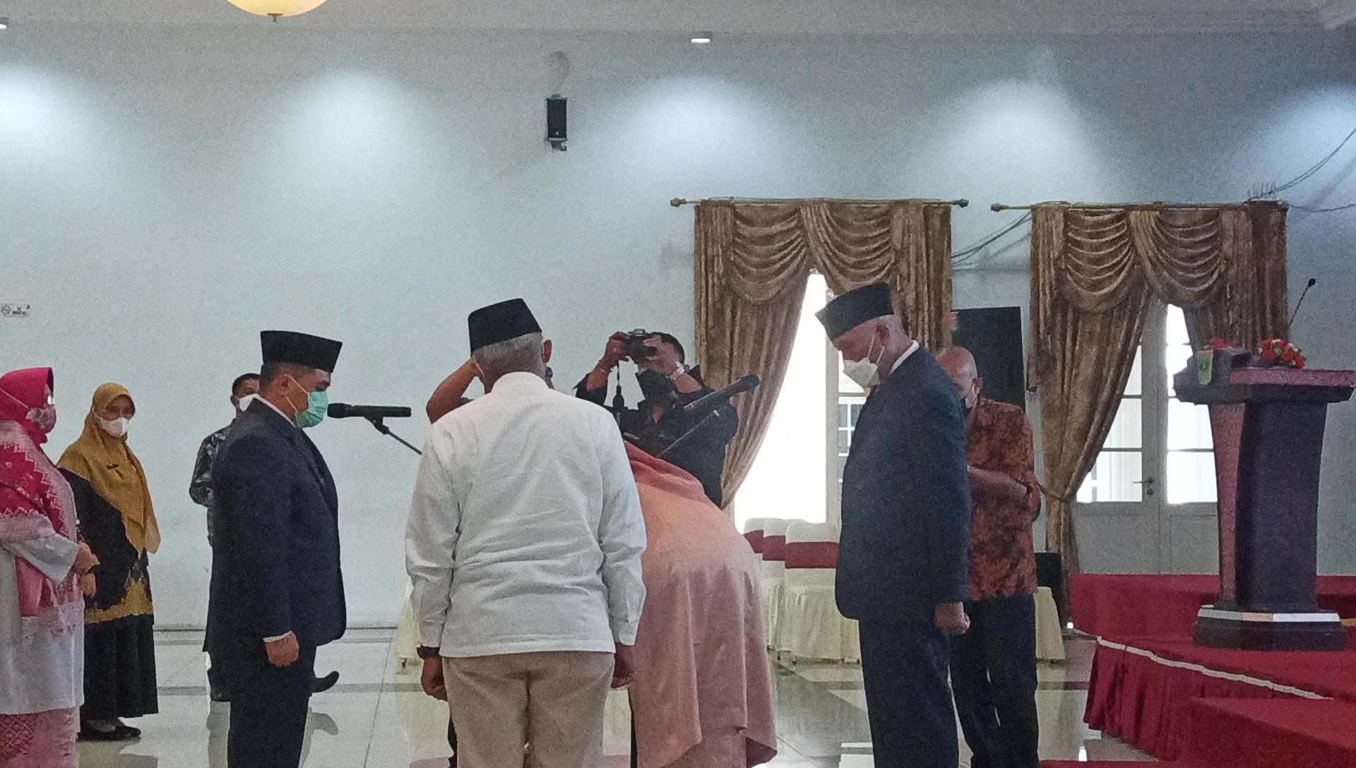 Gubernur Sumbar Mahyeldi melantik Benny Warlis dalam sumpah jabatan bertempat di Auditorium Gubernuran Sumbar, Jumat (16/4/2021).