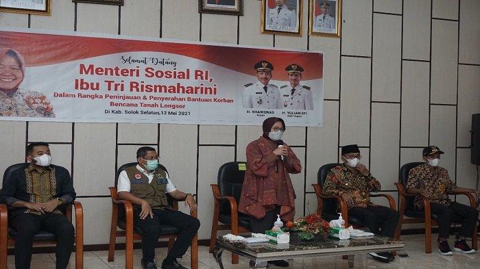 TRIBUNPADANG.COM, SOLOK SELATAN -- Menteri Sosial (Mensos) RI, Tri Rismaharini mengunjungi keluarga korban musibah longsor tambang emas diduga ilegal di Solok Selatan, Provinsi Sumatera Barat (Sumbar), Rabu (12/5/2021).