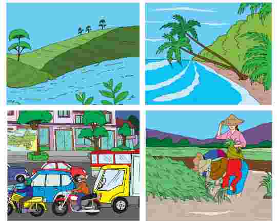 Hari ini Pak Tagor mengajak Siti dan teman-teman untuk melakukan kegiatan di luar kelas. Siti dan teman-teman menyambutnya dengan gembira. Ke mana mereka akan melakukan kegiatan? Oh, ternyata mereka menuju ke belakang sekolah. Di sana terdapat hamparan sawah dan sungai. Dari belakang sekolah juga tampak daerah pegunungan. Pak Tagor menjelaskan mengenai kenampakan alam Indonesia.