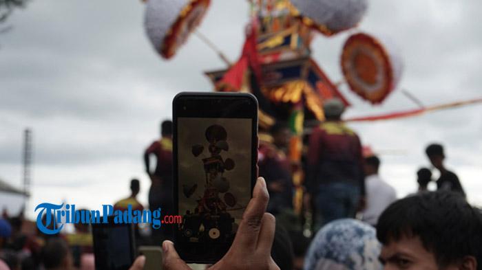 Seorang pengunjung mengabadikan momen prosesi maarak Tabuik saat memasuki pantai Gandoriah melalui telepon genggamnya di Pantai Gandoriah, Kota Pariaman, Sumatera Barat, Minggu (14/8/2022).