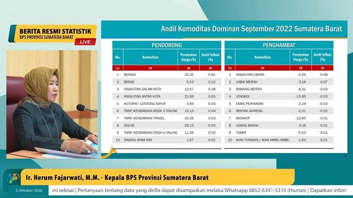 Hal tersebut disampaikan oleh Kepala Badan Pusat Statistik (BPS) Sumbar, Herum Fajarwati melalui live streaming di Youtube Resmi BPS Provinsi Sumatera Barat, Senin (3/10/2022).