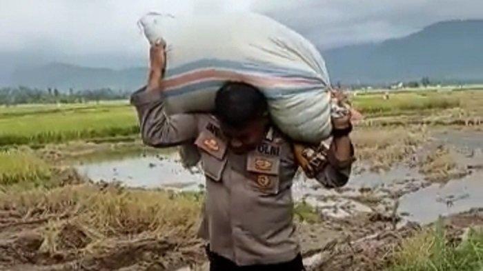 Bripka Zalpriadi yang masih menggunakan baju dinas masuk ke dalam sawah dan memikul karung padi milik petani.