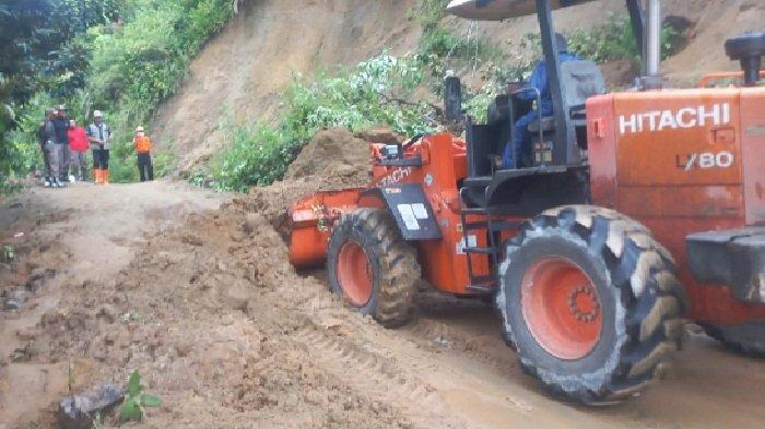 Longsor menutup semua badan jalan di lokasi dengan ketinggian gundukan material 1,5 meter.