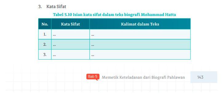 Kunci jawaban Bahasa Indonesia kelas 10 halaman 143 Kurikulum Merdeka membahas tentang Tabel 5.10 Isian kata sifat dalam teks biografi Mohammad Hatta.