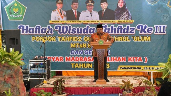 BUPATI Agam, Dr H Andri Warman hadiri haflah wisuda tahfiz ke-III MTsN 8 Kabupaten Agam, Provinsi Sumatera Barat (Sumbar) pada Kamis (16/2/2023).