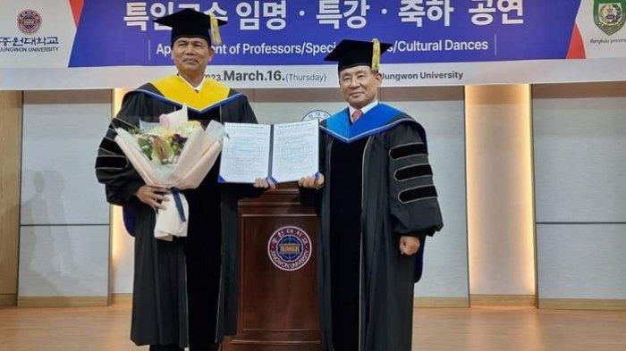 Pengukuhan gelar kehormatan profesor tersebut dilakukan oleh Rektor Jungwon University Presiden Profesor Hwang Yun-Heon di Korea Selatan.