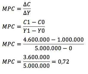 Langkah pertama yang harus dilakukan adalah mencari besarnya hasrat menkonsumsi marjinal atau marginal propensity to consume (MPC) dengan rumus berikut ini: