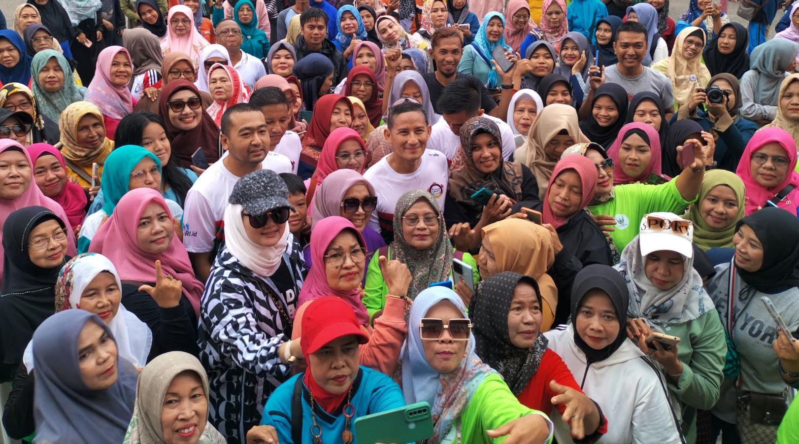 Momen Sandiaga Uno Dikerubungi Emak-Emak saat Ikut Senam Pagi di GOR Haji Agus Salim Padang