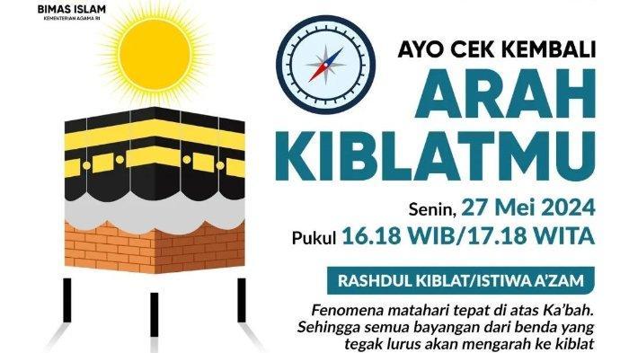 “Peristiwa Istiwa A'zam atau Rashdul Kiblat akan terjadi pada hari Senin dan Selasa, 27 dan 28 Mei 2024 bertepatan dengan 18 dan 19 Zulkaidah 1445 H pada pukul 16:18 WIB atau 17:18 WITA. Saat itu, matahari akan melintas tepat di atas Ka'bah," kata Adib, dikutip dari laman resmi Kemenag.