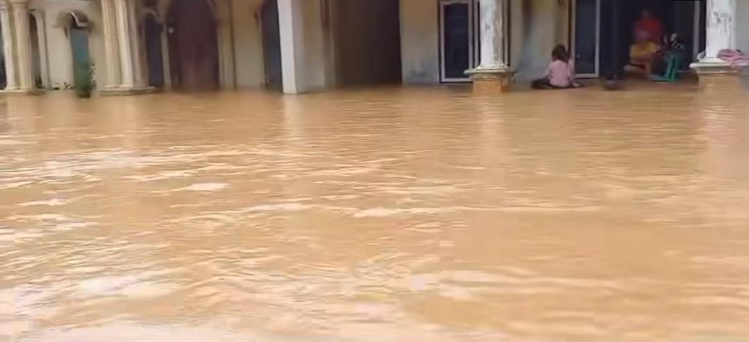 TRIBUNPADANG.COM, DHARMASRAYA - Intensitas hujan tinggi sejak malam hari mengakibatkan banjir di Jorong Kampung Surau, Nagari Gunung Selasih, Kecamatan Pulau Punjung, Kabupaten Dharmasraya, Senin (8/7/2024).