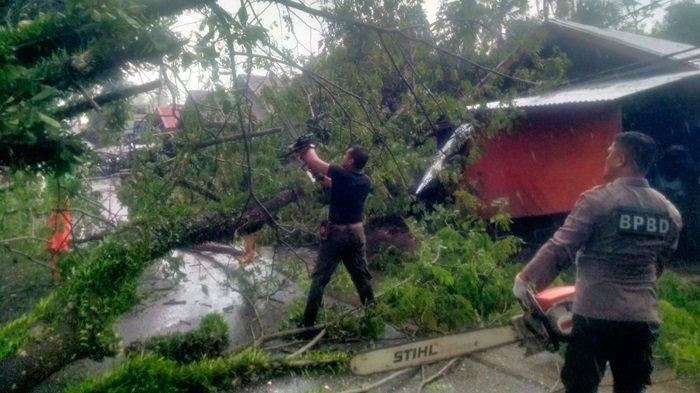 Ia menjelaskan, pohon tumbang ini menghambat akses jalan, menimpa kabel, dan mengenai atap warung milik warga.