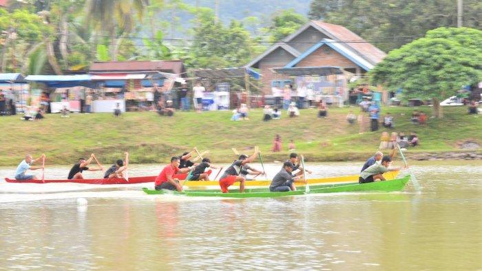 Pacu perahu berlangsung di Talago Anguih Jorong Baringin Sakti, Nagari Taluak, Kecamatan Lintau Buo, Kabupaten Tanah Datar, Provinsi Sumatera Barat.