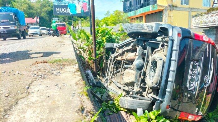 Sebuah minibus terperosok ke pekarangan rumah warga usai terlibat kecelakaan di Cingkariang, Agam, Jumat (10/6/2022).