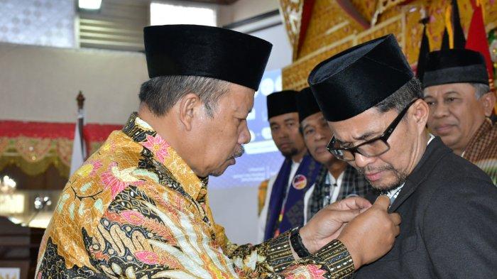 Dr. H. Andri Warman, MM dan rombongan disambut dengan pengalungan ulos, selendang khas Sumatra Utara.