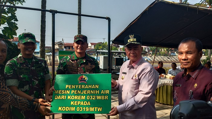 Korem 032/Wirabraja serahkan mesin penjernih air pada Kodim 0319/Mentawai, di Kota Padang Provinsi Sumatera Barat (Sumbar)