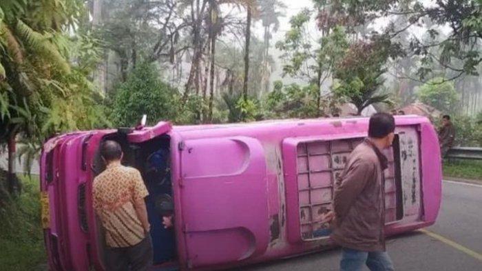 Satu unit minibus terbalik di Jorong Padang Laweh, Kecamatan Bonjol, Kabupaten Pasaman, Sumatera Barat (Sumbar), Selasa (17/1/2023). Peristiwa ini ...