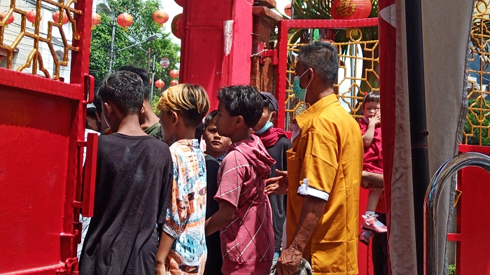 Warga pencari angpao memadati kawasan pintu masuk Kelenteng See Hin Kiong Padang, Selasa (1/2/2022). Mereka berkerumun menunggu jemaah yang selesai